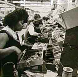Close-up of the UDPU assembly line. The hose in front of the woman's right arm is connected to an air-operated power nut-driver. The chassis she is working on does not appear to be on one of the trolleys, but rather is sitting on a wooden fixture to hold it in the correct position for adding parts. The bins in front of her hold the various parts she will be adding. It appears that the woman to her left is working on the top of the chassis, while she is working on the inside. |