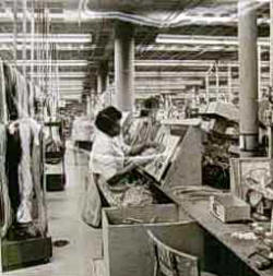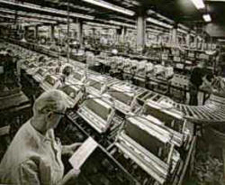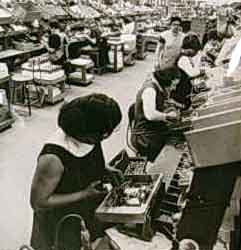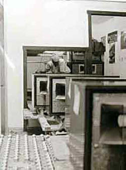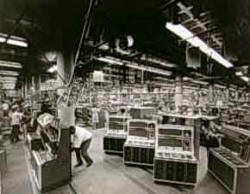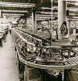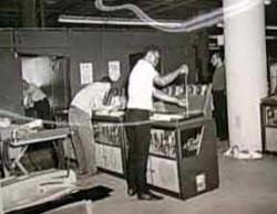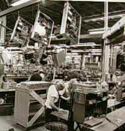When a chassis was completely built, passed inspection and test, it was put on a conveyor, which ran throughout the third floor, along the ceiling. The conveyor was at a height well above your head, so you would not walk into the moving chassis. But be careful if one of them fell off! It swooped down at various places so that chassis could be put on the conveyor (at the end of each subassembly line) or taken off (on the jukebox production line). The stamped flat and riveted sheetmetal pieces with a large hole in them (the one you normally use as the 'handle' to pull the chassis out of the jukebox), is actually the hanger that the conveyor hook fits into. These conveyors were not only used for finished chassis, but were used to move them between the riveting, silk screen/painting, and subassembly departments. The conveyor can be seen at the top of the photo. On the conveyor at the left is an amplifier, followed by a control center and another amplifier. |