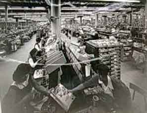 View of one of several chassis assembly lines on the third floor of the new building. The woman in the left foreground, is handing a partially completed UDPU6 Pricing Unit to the other woman. There is a wheeled cart behind the second woman, holding several of these chassis. In front of each assembly position on the subassembly lines was a pair of rails fastened to the bench. Each chassis was placed into a collapsible trolley, whose wheels ran along the track. The person on the first position on the line (which would be on the left side of the ceiling support pillar) would place the painted/silk screened and riveted chassis onto the trolley, and mount the transformer, solenoids, subassemblies, etc., to the chassis. When this operation was complete, this worker would pass the chassis to the person on his or her right, who would add parts, wiring, etc., and pass it on. The next-to-the-last person (or persons, depending upon the complexity of the chassis, and daily production rate) would do all of the soldering. The last person would inspect for correct components, proper soldering, correct connections, etc. Finally, the chassis would be tested on a piece of test equipment specially designed and built for testing that chassis. Seeburg had several of these subassembly lines, one for each chassis used in the jukebox. |