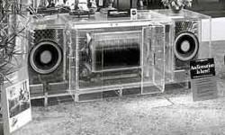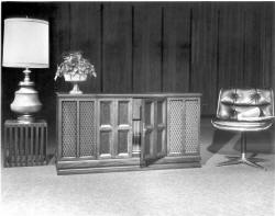 dates from around that time. From the brochure: The exciting FUTURA cabinet - a dramatic combination of tempered glass and chrome available in two models. FUTURA I - elegant black tempered glass and chrome. Front doors being an entirely new decorative form of light sculpture to cabinet design. FUTURA II - features clear tempered glass cabinetry which allows the entire unit to be integrated into the mood of virtually every room decor. Provisions are made for self-decorating - simply insert material, wall paper, tapestry or art prints between the clear glass panels. With FUTURA II you can create cabinetry to accommodate a multitude of decorator settings. Photo and brochure courtesy Hildegard Stamann. |