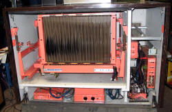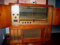 200 Selections, intermixed 10- and 12-inch 78 RPM records. SL1 is the library unit (mechanism and cabinet) only. SLB1 is the library unit and base unit with no amplifier or speaker. BA1 is the base unit with amplifier and speaker. B1 is base unit without amplifier and speaker. Introduced sometime around 1948. This machine (and SICM) used manually-operated levers to make a selection. The SICM was an industrial version, built for factory and office building background music. See the description under 200C1, below, for details of the lever selection system. Photo courtesy 'Seeburg Ed'. |