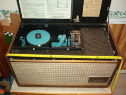 Introduced 1967. Price (May 1969) $1295 Seeburg decided to get into the home stereo business in a big way, releasing 5 different models plus accessories, pictured here and below. This machine also used the 12-inch 33 1/3 RPM mechanism in a fine cabinet including speakers and an AM/FM tuner. The receiver was built by G.I. of Canada, and wasn't too reliable. For this series of home stereo units, selections were made by entering a two-digit code (00 through 99) on a rotary telephone dial. Extra buttons permitted all selections to be played, or all to be cleared. The dial connected to a stepper unit, contained in the control center along with the power supply, and other miscellaneous circuitry. This machine used the 3S12T1 mechanism, similar to the 13S12T1 used in the AMS, but eliminating the ability to play the background music records and cam plates. Also, it was different in color (brown vs. coral for the 13S12T1).
