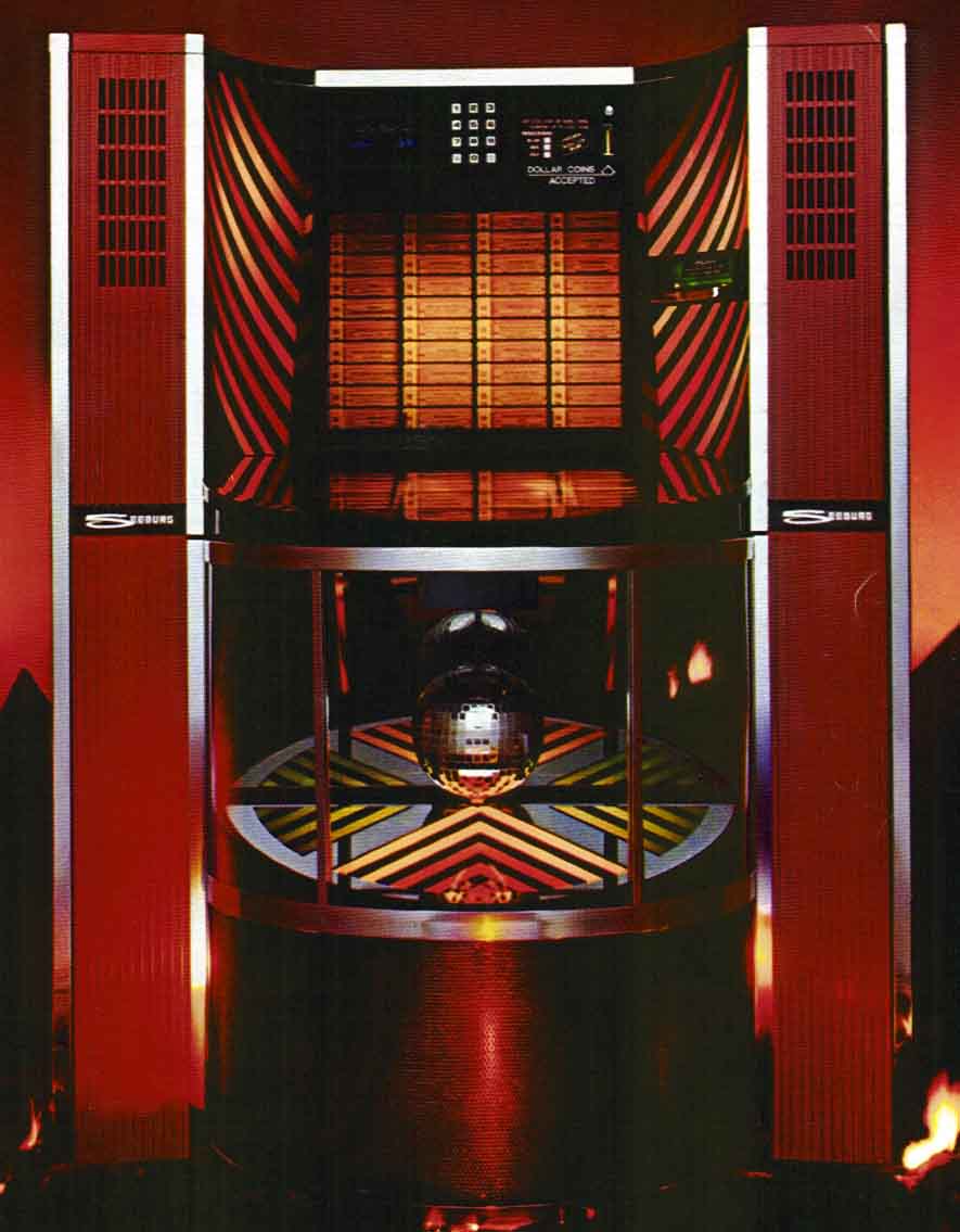 Seeburg SMC2 Phoenix 160 Selections, 45 RPM. Introduced fall, 1979. This machine is a facelift of the SMC1. Very few of these were built by Seeburg, as they went bankrupt shortly after production began. It can be distinguished from the later Stern/Seeburg SMC2 Phoenix as having the vertical speaker panels in brown, rather than orange (see below). For the Seeburg version, the disco ball rotates whenever the machine is on, but here the lights are on only when the mechanism is running. Books applicable to this machine: Red & MCU Combination offer, Red & MCU, Mech book, SHP Amp |