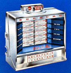 200-selection Wallboxes were made. They are: V-3WA-N, V-3WA-D: The difference between the -N and -D models was the pricing setup. The -N was set for nickel play (single = 5¢, EP = 10¢, using the DCU Pricing Unit). The -D was dime play (single = 10¢, EP = 15¢, using the DCU-10 Pricing Unit. The pricing on these and the following models was fixed at the factory. It could not be changed without new parts or jury-rigging. D-3WA, D-3WU: Both of these were set at 10 cents for a single. 'U' indicated a universal model, which could be used on 100, 200, or 160-play jukeboxes. Changing from a 200/160 to a 100-selection model required replacing the number stickers to correspond to the system used on the 100-select models. The stickers were included with the Wallbox. These models came with 'tie backs' that would lock all unused pages from turning. Changing to a 160 only required using the tie backs, and ignoring the 9 and 0 buttons on the keyboard. A clip was inserted into the keyboard, preventing 9 and 0 from being pushed for the 160-plat version. For the 100-play version, the clip prevented the L through V buttons from being pushed. Both models were equipped with the DPU-10 Pricing Unit. The 'D' stands for Dual Pricing.