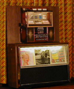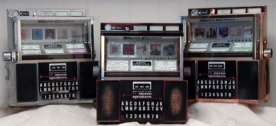 SC, SCH Consolettes: Price (October, 1963) $265. Introduced at the same time as the LPC1 Console was the Stereo Consolette or SC1. Three models were produced. The SC1 had a chrome finish (shown at left). The SC-2 had an antique bronze finish, and the SC-3 had a Golden finish. See the following photo. The SCH models were produced as a chrome finish(-1) and SCH-2, an antique bronze. They were introduced along with the SS160 phonograph (1965 introduction for 1966 model year), and can be distinguished from the SC series as having a larger coin entry to accommodate the U.S. half-dollar coin. They are NOT backwards compatible with the SC models due to revised audio control circuits. They can be used on a separate circuit; one additional wire must be added to the ten wire cable to use these on the same jukebox as the SC models, if you want all the features to operate. They will not operate with older jukeboxes unless the juke itself is modified. The SCH also differed in that it would accept half-dollar coins (the 'H' in SCH), while the SC models took only nickels, dimes and quarters. They had a pair of speakers built in, so that you could hear your selection, and at the same time control the volume. Also included was the ability to remotely keep track of the amount of money in each Consolette, recorded on the optional Remote Income Totalizer, a box located in the Console. When Seeburg introduced these units, they decided to make them as incompatible as possible with the older 3W1, 3W100, 3WA, and 3W160 Wallboxes, to guarantee that the competitor's Wallboxes would not work. To do this, the order of selection transmission was reversed, and the number of pulses output for each letter and number selection was changed. It was relatively straightforward to 'reprogram' the Remote Control Stepper to handle these changes, but the wiring inside the earlier Stepper was too short to do so easily. After a couple of years of major complaints by the operators this was fixed, and instructions were included in the Stepper kit showing how to covert for 3Wx use. With the introduction of the Black and Gray box machines, a translator (SRT1) was made available to translate the codes output by the SC/SCH series Consolettes into the format used by these new machines. With effort, it is possible to convert an SRT for use with a 3Wx Wallbox. Photo supplied by Kevin Green. Much of the above information was provided by Ron Rich. Books applicable to this machine: Console-Era Jukeboxes |
