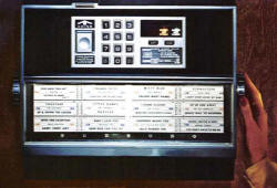 DEC1, 2, 3, 4 Digital Electronic Consolette, built over several years. It was designed specifically for the Black & Gray box machines. DEC1 (shown at left), and DEC3 were chrome. DEC2, DEC4 (below) were bronze-colored. Other than that, they were very similar. All used the black box internally. The only difference between the DEC1 and DEC3, and DEC2 and DEC4, was that the newer models had a small plastic 'jewel' inserted into a hole molded in the case just above the selector, which served as a 'pilot light' to indicate it was on, and a different selector, which flashes the 'Reset and Re-Select' lamp when an incorrect selection is made. The selector was changed back to the non-flashing version in later production, undoubtedly as a cost reduction. Another difference is in the volume control board for the speakers. The DEC3, 4 used a less complicated and therefore cheaper switch on this board. Translators were available to use any of these with the Red box (DCT1) or MCU (DMT1) machines. Suggested retail price (DEC3, 4September, 1974) USD $354.00. Books applicable to this machine: Black & Gray, Red & MCU |