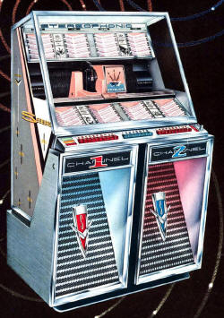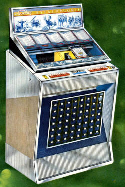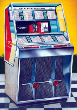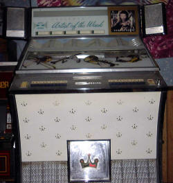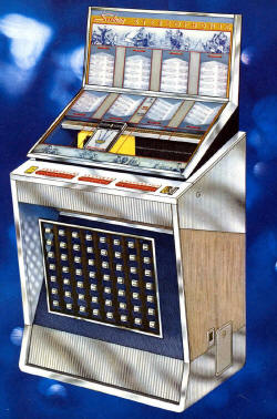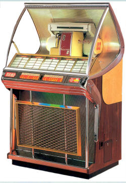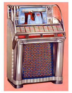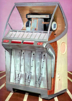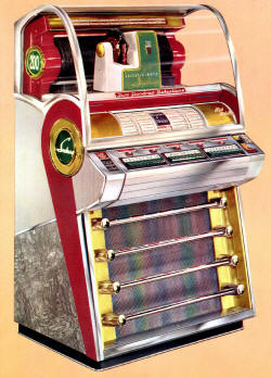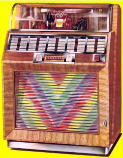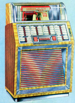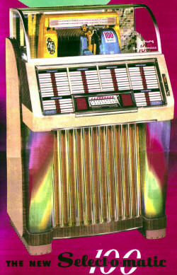 45 RPM. Introduced August, 1955. Price $1095. Pricing: 1 play, 5¢. 2 plays, 10¢. 6 plays, 25¢. The 100JL was introduced in October, 1956 and is similar, using a different mechanism, selector, and color scheme. Its price was $1145.