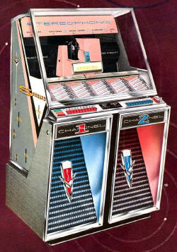 Universal Pricing. Introduced December, 1961. Price: $1530. Very similar to the DS160 below. Photo provided by Patrick Jordan. Thanks, Patrick! The only exterior difference between this machine and the DS160 is that the title strips below the small mechanism viewing window have been deleted, and replaced with graphics showing un-attached hands playing instruments. The instruments are (left to right) trombone (my oldest son plays a mean trombone!), clarinet, trumpet, and guitar. These graphics are identical to those on the AY100, above. 'DS' stands for Directional Stereo. Same basic cabinet as the Q100, Q160. Books applicable to this machine: Mech book |