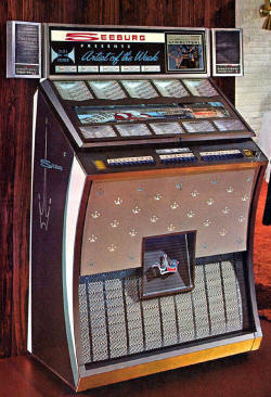 45 RPM. Singles cost 5¢, Extended Play (EP) records cost 10¢. V200D 200 Selections, 45 RPM. Singles cost 10¢, EP records cost 15¢. Introduced August, 1955. Price $1195. Dual pricing. Here, Seeburg introduced three major innovations: 200 selections, dual pricing, and the solid-state Tormat memory. Just when the competition had caught up with 100 selections (some had temporarily eclipsed Seeburg with 120), Seeburg turned around and offered 200 selections. For Seeburg, this was a simple change, just revise the base casting and put more separators in the record magazine, especially as compared to everyone else, who would have to redesign their entire carousel systems to keep up. But to keep cabinet width reasonable, the spacing between records was decreased, making the entire mechanism a bit narrower. This also helped to cut down on the 'dead time' between records. Dual pricing offered the possibility of charging more for playing an EP record, having two selections per side. The Tormat used computer memory cores to remember which selections had been made but not yet played, replacing the magnet-operated levers used in the previous machines. Another innovation is the motor-operated selection drum. With 200 selections, a significant amount of cabinet would be taken up by the title strips. Instead, 40 selections are displayed at a time, with five push-button switches used to move between selection groups. The groups included: Hit Tunes, Rhythm & Blues, Folk & Western, All-time Favorites, and Classics & Varieties. The motor-operated drum sometimes gave problems, so aftermarket suppliers such as Wico, Inc., offered a 'flat-top' kit to replace the upper portion of the cabinet with a title board displaying all 200 titles. Unfortunately, this detracts from the value of the machine. The horizontal grille bars of this machine, shows the Detroit styling influence, similar to the automobiles of the time. There was also a hideaway version of this machine (HV200) introduced in August, 1955. It cost $975. The VL200 was introduced in October, 1956, and is similar, with different cabinet and mechanism colors. This machine featured an improved version of the Tormat selection system, which was simplified, and made more reliable. Its price was $1295. As in the V200, there were two versions: VL200N with nickel play singles, dime play EPs, and VL200D with dime play singles and 15¢ EPs. There was also a hideaway version of this machine (HVL200) introduced in October, 1956. It cost $990. There was also a kit to replace the TSR1 (Tormat Selection Receiver) of the V200 with the improved TSR3 used in the VL200. Machines so converted were called V200X. Books applicable to this machine: Mech book |