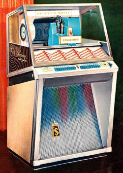 AQ100. Single Pricing. Q100H 100 Selections, 45 RPM native, 33⅓ RPM with optional Auto-Speed engaged. Single Pricing. Accepts half dollars. Q100A 100 Selections, 45 RPM native, 33⅓ RPM with optional Auto-Speed engaged. Accumulative Pricing, which means that several coins could be inserted before selections were made. Q100AH 100 Selections, 45 RPM native, 33⅓ RPM with optional Auto-Speed engaged. Accumulative Pricing. Accepts half dollars Introduced November, 1959. Price: $1325. This and the Q160 (below) introduced the 'Little LP' concept, replacing the EP 45 RPM records having two selections per side with a 33 1/3 7-inch record with three selections per side. In order to play these records, an optional Auto-Speed electronic power oscillator was required, to change the frequency of the AC power to the mechanism motor from the nominal 60 Hz (U.S.) to about 44 Hz. For Europe and Japan, the motor Mains supply was changed from 50 to about 36 Hz. When so equipped, the model number became AQ100 ('A' signifying Album play). The albums were the standard 7-inch diameter, but had a smaller center hole (5/16 inch) versus the nominal 1 1/4 inch center hole of the 45 RPM record. The smaller hole prevented the mechanism clamp arm from inserting completely into the record, closing a switch to activate the Auto-Speed. Many 45 RPM singles in Europe also use the smaller center hole, requiring the use of a 'dinker' to permit them to be played machines equipped with the Auto-Speed. This model introduced a new cabinet design. Mechanism visibility is starting to be restricted, with more space taken up by the title strips and graphics. There was also a hideaway version of this machine (HQ100SR). Books applicable to this machine: Mech book |