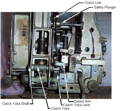 The mechanism includes a ‘Safety Plunger’, to insure that damage to the record or the mechanism does not occur from a warped record. The Safety Plunger is mounted at the rear of the carriage, on the side facing the record magazine, and is shown in the photo at left. Whilethe record is being transferred back into the magazine, the Safety Plunger is released to move into the area formerly occupied by the record. A warped record will prevent this from happening, so the clutch cannot shift back into scan, resulting in the record being transferred into play again. Another possibility is a worn on poorly-lubricated clutch shifting lever, or a poorly lubricated Detent Arm. The trip and play again sequence will repeat until the obstruction is removed or the power is turned off. Years of inattention, no cleaning and no lubrication will result in what lubrication is left turning into a sticky or solid mass which prevents free movement of the Safety Plunger, duplicating the action of a warped record. A gummed-up clutch shifting lever could also cause this problem. The solution is to disassemble that portion of the mechanism (usually requiring that the magazine be removed to gain access), clean away the ‘gunk’, lubricate and re-adjust whatever was disassembled. If the problem is caused by lack of lubrication of the Detent Arm on its shaft, you will probably have to remove the clutch assembly to gain access. The mechanism Operation and Adjustments manual for your jukebox does a very good job of detailing which adjustments affect others, and which adjustments must be correct before making another. Before attempting to clean up your mechanism, get a copy of this manual. It's available from: Always Jukin', Victory Glass, or Stamann Musicboxen for those in Europe. Before cleaning the mechanism, remove the motor, trip solenoid, cartridge, trip switch, and memory unit. Use a water-based degreaser followed by plenty of fresh water, and make sure it dries completely before doing anything else. Ron Rich's Seeburg Mechanism Guide has a step-by-step procedure that guides you through removing and taking apart the clutch assembly. You should consider getting a copy before attempting clutch disassembly or mechanism degreasing.